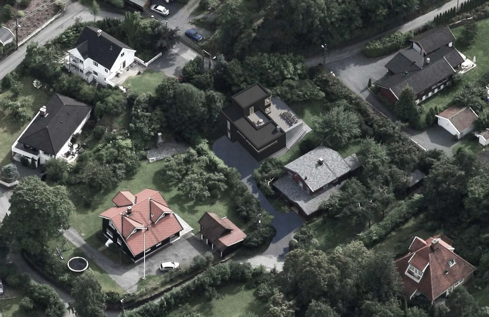 Eneboligen ligger delvis inn i terrenget hvor hver av de tre etasjene forholder seg til omgivelsene og tomtens kvaliteter. Adkomsten til boligen er inntrukket og intim med fasader som gir et lukket uttrykk, mens baksiden åpnes opp med store vinduer mot den frodige hagen omringet med tett vegetasjon.